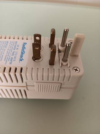 This is a Radio Shack 1600 watt outlet convertor which will convert any voltage difference to your US standard 110v-120v for those appliances you travel with from the US. There are different outlet plugs to fit the outlet in the country you are visiting. There is a reset button, indicator light, a probe to help push the converter off the outlet, and control switches on the side to transfer power voltage.