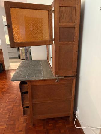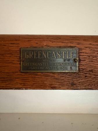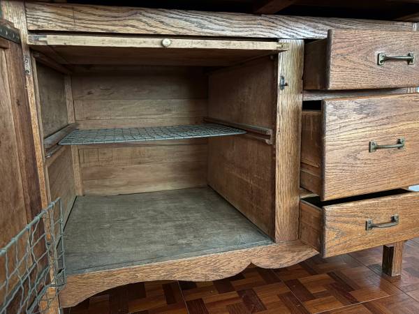 Antique Oak Cabinet with pull-out zinc-sheet metal countertop. Top shelving comes off, anchored by screwed-on metal side grips. Made in Greencastle Indiana. Glass and findings original. Louvered shutters and drawers need rebuilding. Dates early 1900's and owned for 40 yrs from Wash. DC area. No termites. A great shop or restaurant display case, a TV stand, a country home piece.