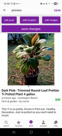 This Ti is so pretty. Grown in Part-sun. Healthy. Decorative. Just re-potted so you won't need to re-pot. Dark Pink- Trimmed Round-Leaf Prettier Ti Potted Plant 4 gallon Reduced from $40