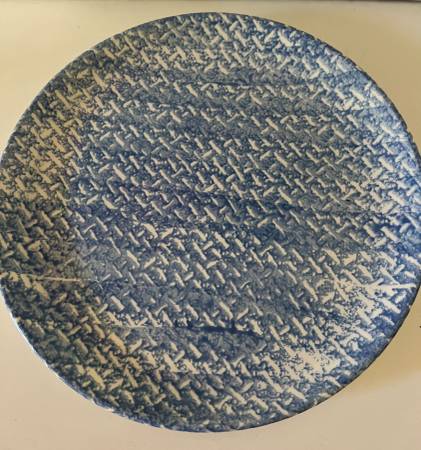 Beautiful ceramic pie dish with matching plate. Vintage Los Angeles Potteries Ovenware blue spongeware with Rooster pie plate The large plate underneath matches the blue spongeware scallop edging of...