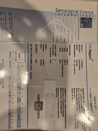 It was purchased for $3600 from Kay's, have numbers, and can be looked up in their system - asking $1500. Comes with appraisal from GemScience (see photos) and the original purchase price of $3600 could be applied to an upgrade at Kay's for a different piece of jewelry in the future.