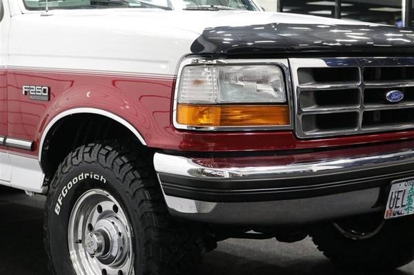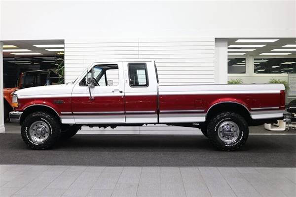 UP FOR GRABS IS A SUPER HARD TO FIND IN THIS SHAPE AND CONDITION AND SUPER LOW MILES LOCAL OREGON SINCE NEW CLEAN TITLE AND CARFAX CERTIFIED 1995 FORD F-250 EXTRA CAB LONG BED XLT 4X4 2-TONE WITH ONLY 59K ACTUAL MILES, LIKE NEW IN AND OUT, NO SIGNS OR RECORDS OF ANY ACCIDENTS OR DAMAGES EVER, NO MAJOR DENTS OR SCRATCHES AT ALL, LIKE NEW INTERIOR FREE OF ANY RIPS OR TEARS OR ANY BROKEN PLASTICS OR STAINS ON THE CARPET. THE UNDER CARRIAGE OF THIS TRUCK IS 100% RUST FREE AND HAS SPENT ALL OF ITS LIFE HERE IN RUST FREE OREGON, THE PAINT ON THE TRUCK SHOWS AS NEW AND IS 100% IN EXCELLENT SHAPE AND HAS NO CLEAR COAT FADING OR PEELING ISSUES, THIS TRUCK IS A LOADED VERSION OF THE XLT WITH FRONT CAPTAIN SEATS, REAR SLIDER, TOWING MIRRORS, TINTED WINDOWS AND MORE. FACTORY ALCOAS IN NEW CONDITION AND WE JUST INSTALLED A NEW SET OF 33" BF GOODRICH KO3 10-PLY TIRES ALL THE WAY AROUND, THE BED IS IN NEW CONDITION WITH ZERO DENTS OR ISSUES AND IS PROTECTED WITH A FULL SPRAY IN BED LINER, NO HOLES NO SPLITS OR ANY DAMAGES AT ALL. THIS F-250 COMES WITH ALL ORIGINAL BOOKS. PREVIOUS OWNER HAD THE TRANSMISSION REBUILT 6K MILES AGO WITH RECORDS, NO OIL LEAKS NO ISSUES.