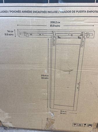 Sliding Barn Door with all the hardware to hang with. White. 36” x 84” which covers the standard door opening. New. Still in the box (we decided to go in another direction in remodeling). Purchased...