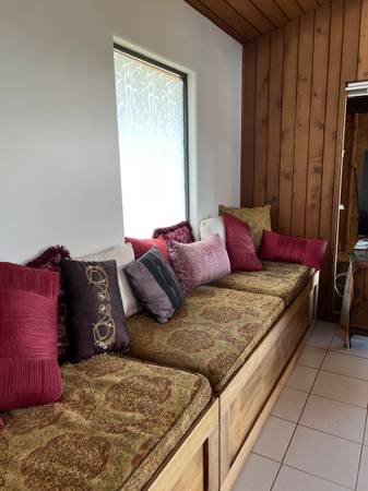 Solid wood, bench seats with storage underneath. Comfortable seats with lots of storage room inside!