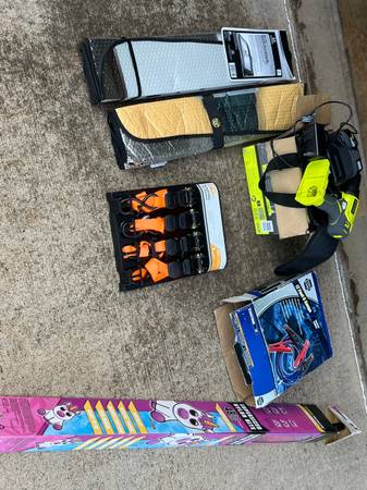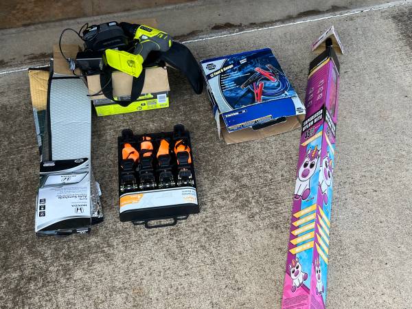 Ryobi drill; Child’s kite; sun shades (2); racheting tie downs; 12 ft 6 gauge jumper cables. 3 garden hose attachments included. $50 for all or nothing Call or text