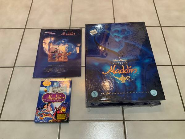 Aladdin Deluce Collector’s Vedeo Edition Box Set VHS Disney Classic (in unopened Box)—$300 / or offer. Please leave return number when inquiring (must) and I will return all ASAP. *Song book and DVD...