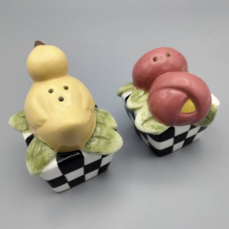 Mary Engelbreit Bird and Flower in Checked Basket Salt and Pepper Shakers. Bird measures: 2 inches wide by 2 inches long by 2-3/4 inches tall. Flower measures: 2 inches wide by 2 inches long by 2-1/4 inches tall. There are small nicks on the Flower Shaker on one flower and a chip on the side of the leaf. This is a used item. Please carefully review all photos and description for details.
