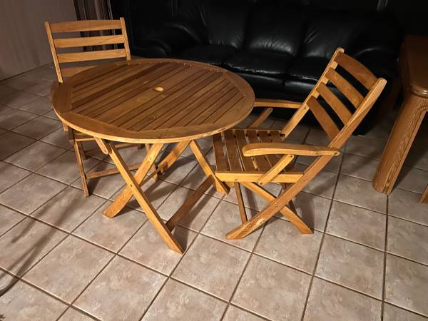 Wood table and chairs for lanai patio or indoor use. 36” diameter Good condition Call or text Dan at 808 five five one 9467