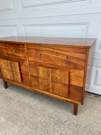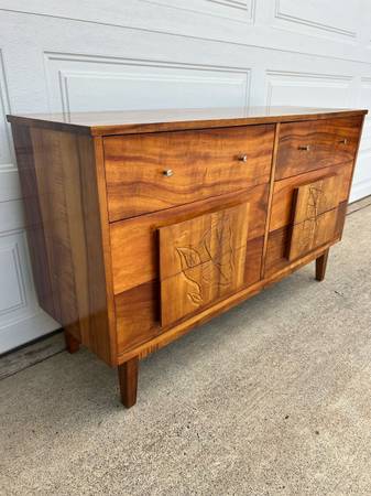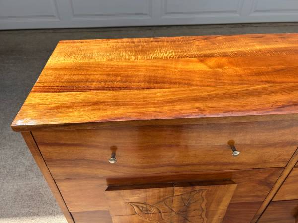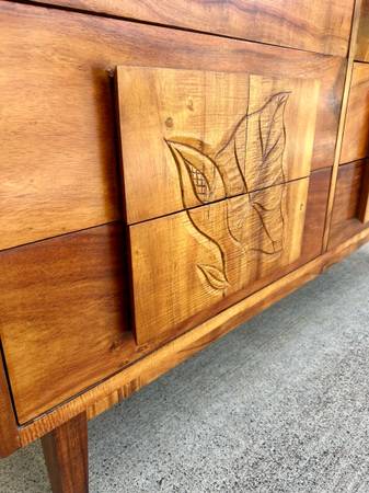 Lustrous Hawaiian Koa Wood dresser with anthurium flower carvings. Wood on wood drawer slides. No damages. Clean and ready to use. Dimensions: 54.5” long, 32.25” tall, 17.25” deep