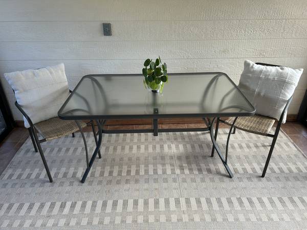 Outdoor patio set. Purchased from Target. In good condition with a few water stains on glass table top. From a smoke and pet free home. Includes: 1 - 3'x5' rectangular table 1 - 32" round table 4 -...