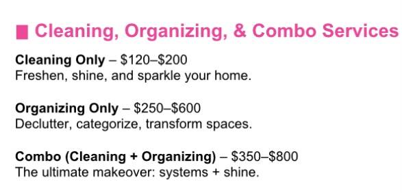 “We clean the chaos AND organize the aftermath—because messes like to come back for encores.” Cleaning services: Whole house Small spaces Carpets, couches, whatever you got Quickies Organization:...