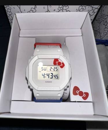 Introducing a very special collaboration and double celebration commemorating the 30th Baby-G anniversary and 50th Hello Kitty anniversary, both in 2024. The BGD565, a classic first-generation Baby-G model, now takes on the white, red, and blue color scheme of the Hello Kitty debut in 1974. The band is covered in printed faces of the charming animated character from the 1970s Hello Kitty laughing, winking, surprised, and sad. Activate the light to see the watch face come to life as her face emerges, topped off by the iconic ribbon motif on the dial. The case back is engraved with an original Hello Kitty design that inverts the motif with watch hands and numbers adorning her face. This Baby-G features a total of 50 Hello Kitty details in celebration of her 50th birthday. Red and blue band rings, as well as the die-cut ribbon detail on the white band loop, add extra whimsey to the charming design. The special packaging is designed in matching colors and features the original Hello Kitty design to please the most ardent fans. Style #BGD565KT-7.