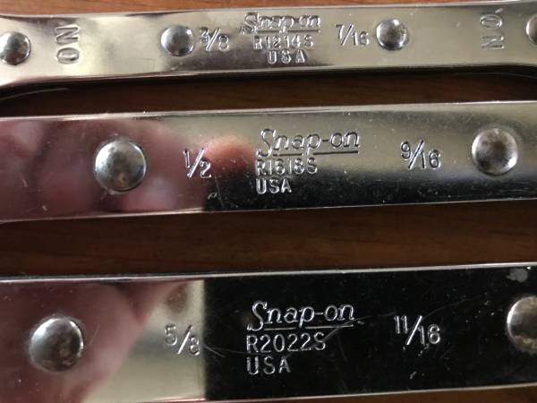 Got some Snap On wrenches that I have picked up over the years, mostly second hand. Two angle head, one is 1 3/8 “, one 15/16”. Two open end combination, 13/16” and 3/4”, other is 11/16” and 5/8”. Set of ratcheting 6 point. 11/16” and 5/8”, one 9/16” and 1/2”, one 7/16” and 3/8”. Will throw in another 12 point 9/16” and 1/2”. All wrenches are in good used condition. I retired and have way too many tools. Thanks for looking.